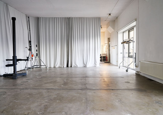 I studion finns finns två giraffstativ med bom, ett pelarstativ samt frigolitreflexskärmar i svart och vitt.