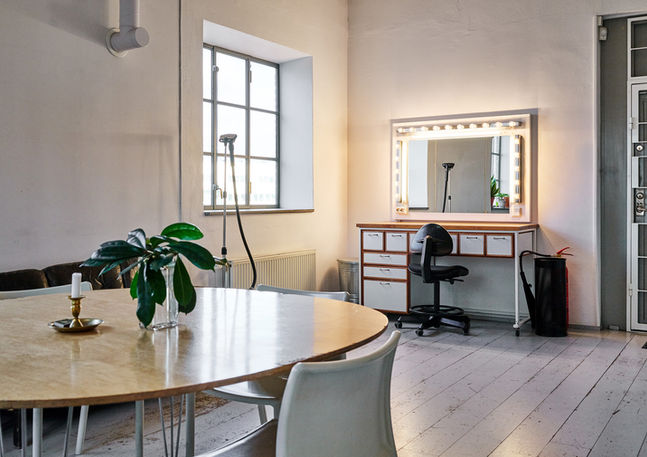 Dessutom en fristående flyttbar vägg på hjul. Den är vit på ena sidan och har upphängning för fondbakgrunder på andra sidan.